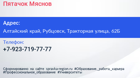 Пятачок Мяснов по адресу Алтайский край, Рубцовск, Тракторная улица, 62Б в дальнейшем Организация, размещена в следующих категориях: