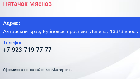 Пятачок Мяснов по адресу Алтайский край, Рубцовск, проспект Ленина, 133/3 киоск в дальнейшем Организация, размещена в следующих категориях: