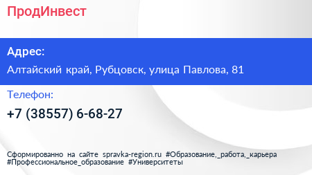 ПродИнвест по адресу Алтайский край, Рубцовск, улица Павлова, 81 в дальнейшем Организация, размещена в следующих категориях: