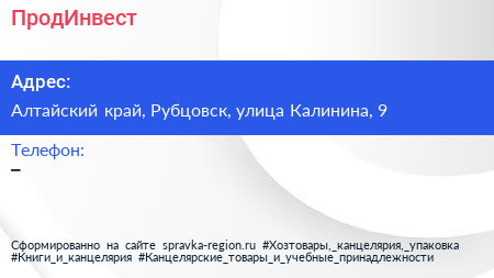 ПродИнвест по адресу Алтайский край, Рубцовск, улица Калинина, 9 в дальнейшем Организация, размещена в следующих категориях: