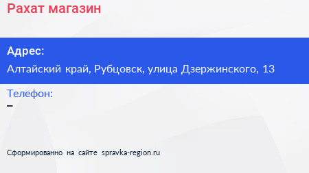 Рахат, магазин по адресу Алтайский край, Рубцовск, улица Дзержинского, 13 в дальнейшем Организация, размещена в следующих категориях: