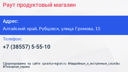 Раут, продуктовый магазин по адресу Алтайский край, Рубцовск, улица Громова, 15 в дальнейшем Организация, размещена в следующих категориях: