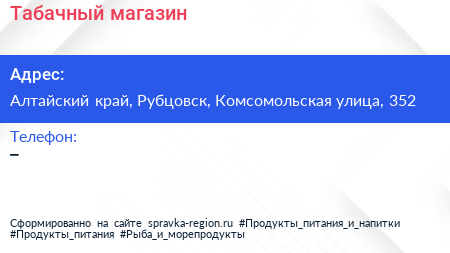 Табачный магазин по адресу Алтайский край, Рубцовск, Комсомольская улица, 352 в дальнейшем Организация, размещена в следующих категориях: