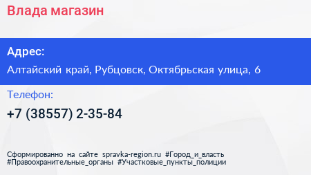 Влада, магазин по адресу Алтайский край, Рубцовск, Октябрьская улица, 6 в дальнейшем Организация, размещена в следующих категориях: