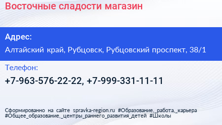 Восточные сладости, магазин по адресу Алтайский край, Рубцовск, Рубцовский проспект, 38/1 в дальнейшем Организация, размещена в следующих категориях: