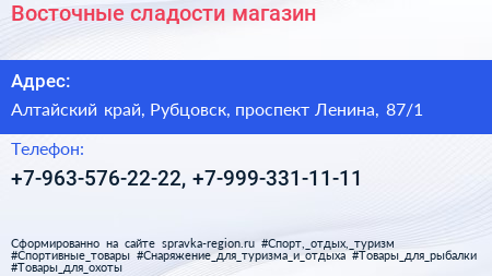 Восточные сладости, магазин по адресу Алтайский край, Рубцовск, проспект Ленина, 87/1 в дальнейшем Организация, размещена в следующих категориях: