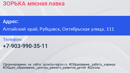 ЗОРЬКА, мясная лавка по адресу Алтайский край, Рубцовск, Октябрьская улица, 111 в дальнейшем Организация, размещена в следующих категориях: