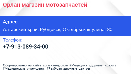 Орлан, магазин мотозапчастей по адресу Алтайский край, Рубцовск, Октябрьская улица, 80 в дальнейшем Организация, размещена в следующих категориях: