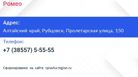 Ромео по адресу Алтайский край, Рубцовск, Пролетарская улица, 150 в дальнейшем Организация, размещена в следующих категориях:
