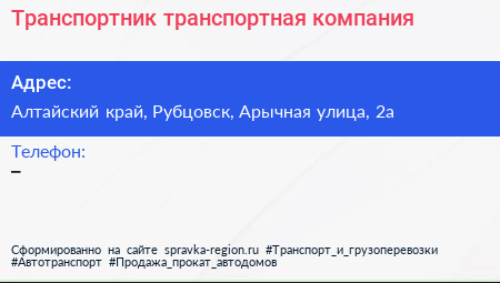 Транспортник, транспортная компания по адресу Алтайский край, Рубцовск, Арычная улица, 2а в дальнейшем Организация, размещена в следующих категориях: