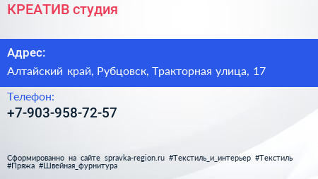 КРЕАТИВ, студия по адресу Алтайский край, Рубцовск, Тракторная улица, 17 в дальнейшем Организация, размещена в следующих категориях:
