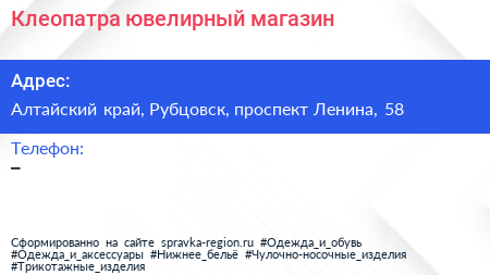 Клеопатра, ювелирный магазин по адресу Алтайский край, Рубцовск, проспект Ленина, 58 в дальнейшем Организация, размещена в следующих категориях: