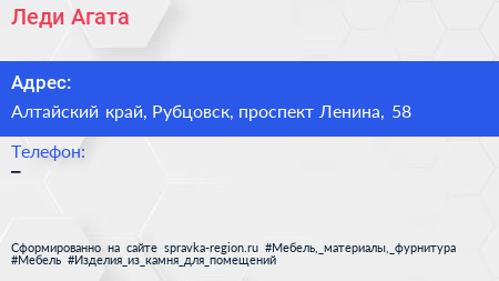 Леди Агата по адресу Алтайский край, Рубцовск, проспект Ленина, 58 в дальнейшем Организация, размещена в следующих категориях: