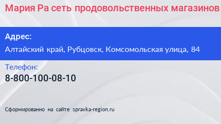 Мария-Ра, сеть продовольственных магазинов по адресу Алтайский край, Рубцовск, Комсомольская улица, 84 в дальнейшем Организация, размещена в следующих категориях: