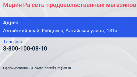 Мария-Ра, сеть продовольственных магазинов по адресу Алтайский край, Рубцовск, Алтайская улица, 181а в дальнейшем Организация, размещена в следующих категориях: