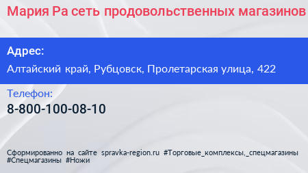 Мария-Ра, сеть продовольственных магазинов по адресу Алтайский край, Рубцовск, Пролетарская улица, 422 в дальнейшем Организация, размещена в следующих категориях: