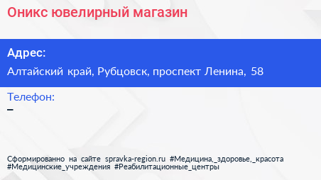 Оникс, ювелирный магазин по адресу Алтайский край, Рубцовск, проспект Ленина, 58 в дальнейшем Организация, размещена в следующих категориях: