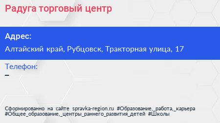 Радуга, торговый центр по адресу Алтайский край, Рубцовск, Тракторная улица, 17 в дальнейшем Организация, размещена в следующих категориях: