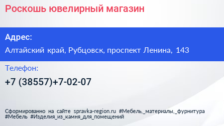 Роскошь, ювелирный магазин по адресу Алтайский край, Рубцовск, проспект Ленина, 143 в дальнейшем Организация, размещена в следующих категориях: