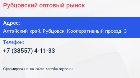 Рубцовский оптовый рынок по адресу Алтайский край, Рубцовск, Кооперативный проезд, 3 в дальнейшем Организация, размещена в следующих категориях: