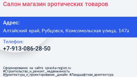 Салон-магазин эротических товаров по адресу Алтайский край, Рубцовск, Комсомольская улица, 147а в дальнейшем Организация, размещена в следующих категориях: