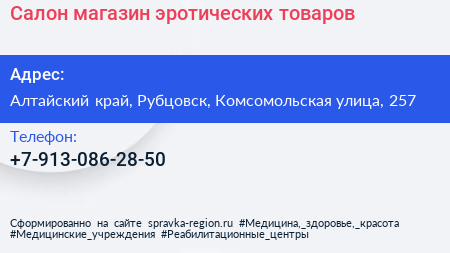 Салон-магазин эротических товаров по адресу Алтайский край, Рубцовск, Комсомольская улица, 257 в дальнейшем Организация, размещена в следующих категориях: