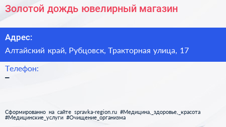 Золотой дождь, ювелирный магазин по адресу Алтайский край, Рубцовск, Тракторная улица, 17 в дальнейшем Организация, размещена в следующих категориях: