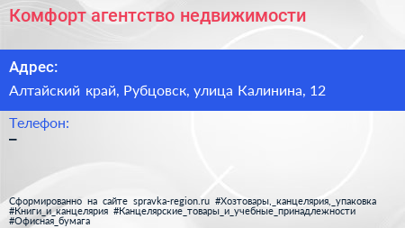 Комфорт, агентство недвижимости по адресу Алтайский край, Рубцовск, улица Калинина, 12 в дальнейшем Организация, размещена в следующих категориях: