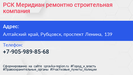 РСК-Меридиан, ремонтно-строительная компания по адресу Алтайский край, Рубцовск, проспект Ленина, 139 в дальнейшем Организация, размещена в следующих категориях: