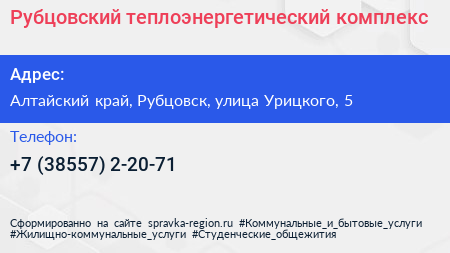 Рубцовский теплоэнергетический комплекс по адресу Алтайский край, Рубцовск, улица Урицкого, 5 в дальнейшем Организация, размещена в следующих категориях: