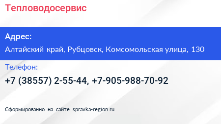 Тепловодосервис по адресу Алтайский край, Рубцовск, Комсомольская улица, 130 в дальнейшем Организация, размещена в следующих категориях: