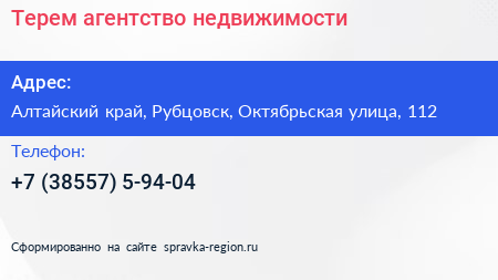 Терем, агентство недвижимости по адресу Алтайский край, Рубцовск, Октябрьская улица, 112 в дальнейшем Организация, размещена в следующих категориях: