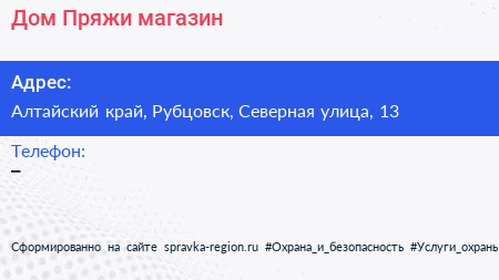 Дом Пряжи, магазин по адресу Алтайский край, Рубцовск, Северная улица, 13 в дальнейшем Организация, размещена в следующих категориях: