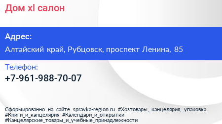 Дом xl, салон по адресу Алтайский край, Рубцовск, проспект Ленина, 85 в дальнейшем Организация, размещена в следующих категориях: