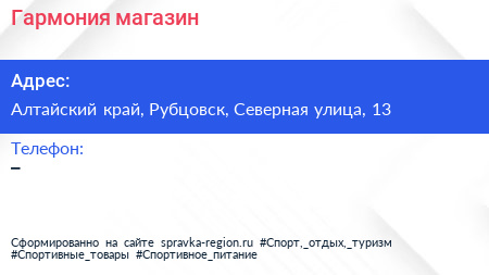 Гармония, магазин по адресу Алтайский край, Рубцовск, Северная улица, 13 в дальнейшем Организация, размещена в следующих категориях: