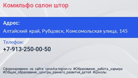 Комильфо, салон штор по адресу Алтайский край, Рубцовск, Комсомольская улица, 145 в дальнейшем Организация, размещена в следующих категориях: