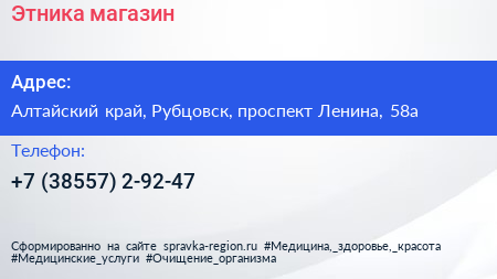 Этника, магазин по адресу Алтайский край, Рубцовск, проспект Ленина, 58а в дальнейшем Организация, размещена в следующих категориях: