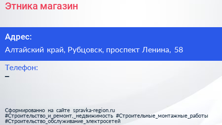 Этника, магазин по адресу Алтайский край, Рубцовск, проспект Ленина, 58 в дальнейшем Организация, размещена в следующих категориях: