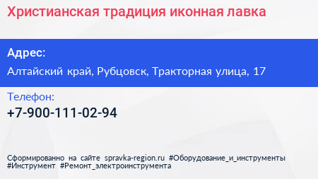 Христианская традиция, иконная лавка по адресу Алтайский край, Рубцовск, Тракторная улица, 17 в дальнейшем Организация, размещена в следующих категориях: