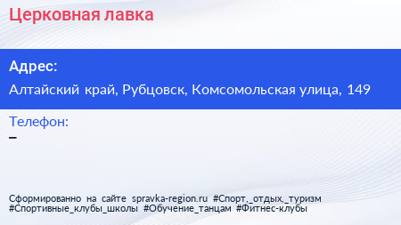 Церковная лавка по адресу Алтайский край, Рубцовск, Комсомольская улица, 149 в дальнейшем Организация, размещена в следующих категориях: