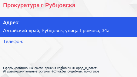 Прокуратура г. Рубцовска по адресу Алтайский край, Рубцовск, улица Громова, 34а в дальнейшем Организация, размещена в следующих категориях: