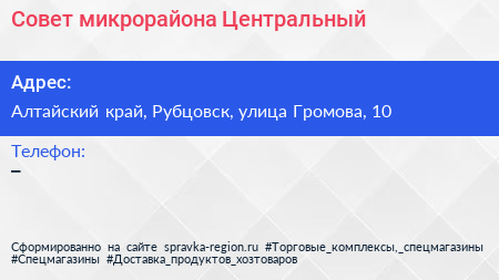 Совет микрорайона Центральный по адресу Алтайский край, Рубцовск, улица Громова, 10 в дальнейшем Организация, размещена в следующих категориях: