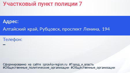 Участковый пункт полиции №7 по адресу Алтайский край, Рубцовск, проспект Ленина, 194 в дальнейшем Организация, размещена в следующих категориях: