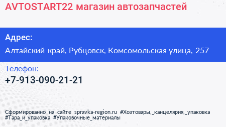 AVTOSTART22, магазин автозапчастей по адресу Алтайский край, Рубцовск, Комсомольская улица, 257 в дальнейшем Организация, размещена в следующих категориях: