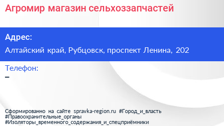 Агромир, магазин сельхоззапчастей по адресу Алтайский край, Рубцовск, проспект Ленина, 202 в дальнейшем Организация, размещена в следующих категориях: