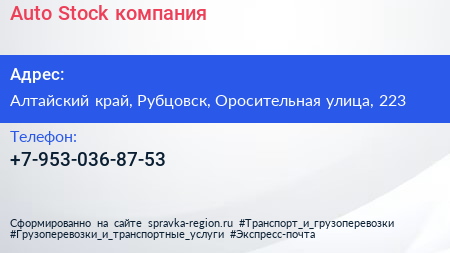 Auto Stock, компания по адресу Алтайский край, Рубцовск, Оросительная улица, 223 в дальнейшем Организация, размещена в следующих категориях:
