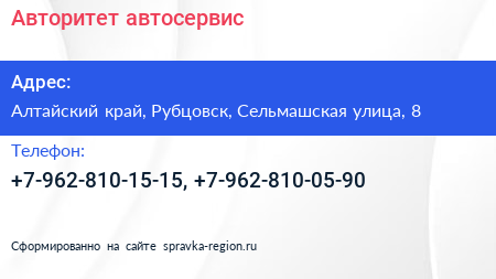 Авторитет, автосервис по адресу Алтайский край, Рубцовск, Сельмашская улица, 8 в дальнейшем Организация, размещена в следующих категориях: