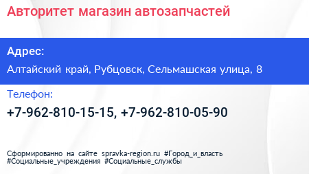 Авторитет, магазин автозапчастей по адресу Алтайский край, Рубцовск, Сельмашская улица, 8 в дальнейшем Организация, размещена в следующих категориях: