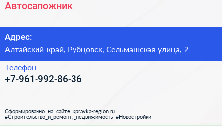 Автосапожник по адресу Алтайский край, Рубцовск, Сельмашская улица, 2 в дальнейшем Организация, размещена в следующих категориях:
