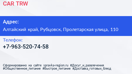 CAR TRW по адресу Алтайский край, Рубцовск, Пролетарская улица, 110 в дальнейшем Организация, размещена в следующих категориях: